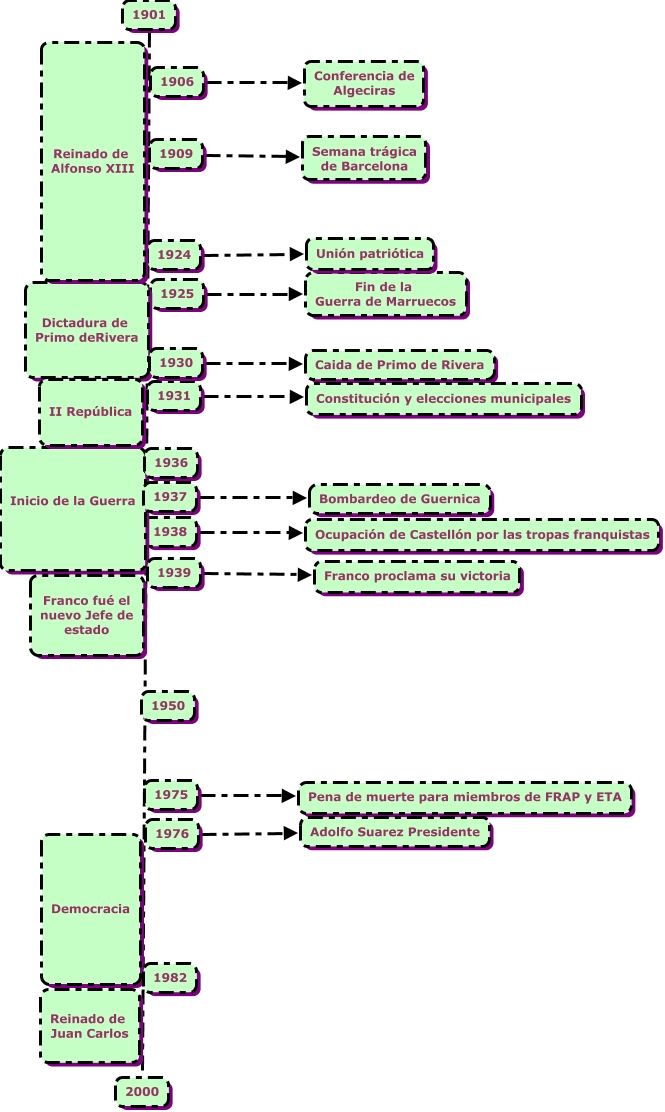 Este mapa conceptual tiene información relacionada a: 22.María Pérez Pedrero.Siglo XX España, 1924 Unión patriótica, 1930 Caida de Primo de Rivera, 1938 Ocupación de Castellón por las tropas franquistas, 1975 Pena de muerte para miembros de FRAP y ETA, 1939 Franco proclama su victoria, 1925 Fin de la Guerra de Marruecos, 1909 Semana trágica de Barcelona, 1906 Conferencia de Algeciras, 1931 Constitución y elecciones municipales, 1901 2000