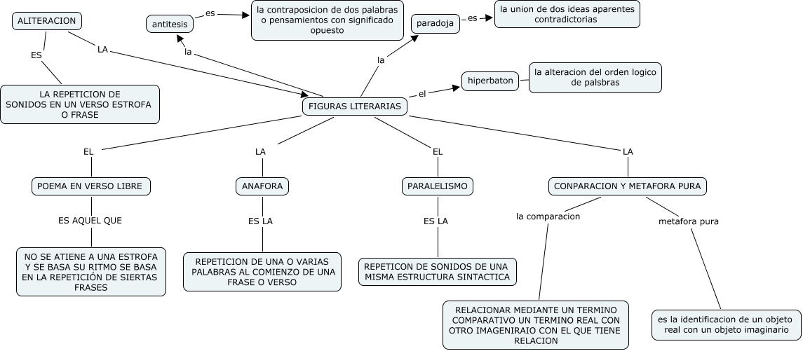 Este mapa conceptual tiene información relacionada a: 8-antonio garcia refuerzo, antitesis es la contraposicion de dos palabras o pensamientos con significado opuesto, CONPARACION Y METAFORA PURA la comparacion RELACIONAR MEDIANTE UN TERMINO COMPARATIVO UN TERMINO REAL CON OTRO IMAGENIRAIO CON EL QUE TIENE RELACION, PARALELISMO ES LA REPETICON DE SONIDOS DE UNA MISMA ESTRUCTURA SINTACTICA, CONPARACION Y METAFORA PURA metafora pura es la identificacion de un objeto real con un objeto imaginario, FIGURAS LITERARIAS EL PARALELISMO, ALITERACION ES LA REPETICION DE SONIDOS EN UN VERSO ESTROFA O FRASE, FIGURAS LITERARIAS la antitesis, FIGURAS LITERARIAS LA CONPARACION Y METAFORA PURA, FIGURAS LITERARIAS el hiperbaton, POEMA EN VERSO LIBRE ES AQUEL QUE NO SE ATIENE A UNA ESTROFA Y SE BASA SU RITMO SE BASA EN LA REPETICIÓN DE SIERTAS FRASES