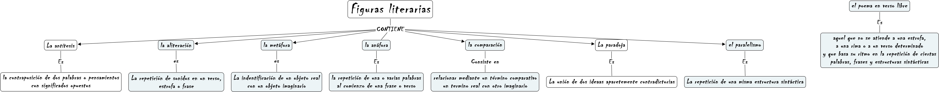 Este mapa conceptual tiene información relacionada a: JAVIER MÁRMOL VIDAL Nº14 2ºA, Figuras literarias CONTIENE la anáfora, la comparación Consiste en relacionar mediante un término comparativo un termino real con otro imaginario, Figuras literarias CONTIENE la metáfora, Figuras literarias CONTIENE La paradoja, Figuras literarias CONTIENE La antítesis, la anáfora Es la repetición de una o varias palabras al comienzo de una frase o verso, el paralelismo Es La repetición de una misma estructura sintáctica, el poema en verso libre Es aquel que no se atiende a una estrofa, a una rima o a un verso determinado y que basa su ritmo en la repetición de ciertas palabras, frases y estructuras sintácticas, Figuras literarias CONTIENE la aliteración, Figuras literarias CONTIENE la comparación