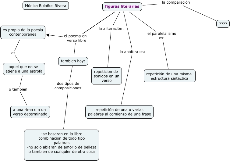 Este mapa conceptual tiene información relacionada a: Monica Bolaños figuras literarias-2ºA, figuras literarias el poema en verso libre tambien hay:, figuras literarias el poema en verso libre es propio de la poesia contenporanea, figuras literarias la aliteración: repeticion de sonidos en un verso, figuras literarias el poema en verso libre es propio de la poesia contenporanea, figuras literarias el poema en verso libre tambien hay:, es propio de la poesia contenporanea es aquel que no se atiene a una estrofa, tambien hay: dos tipos de composiciones: -se basaran en la libre combinacion de todo tipo palabras -no solo ablaran de amor o de belleza o tambien de cualquier de otra cosa, figuras literarias la anáfora es: repetición de una o varias palabras al comienzo de una frase, aquel que no se atiene a una estrofa o tambien: a una rima o a un verso determinado, figuras literarias el paralelalismo es: repetición de una misma estructura sintáctica