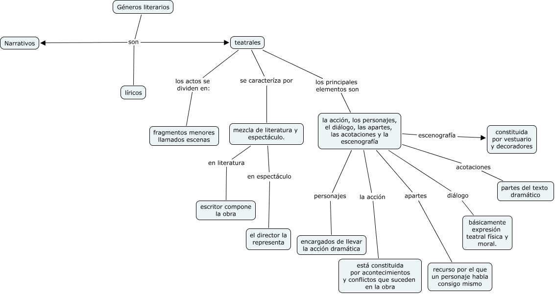 Este mapa conceptual tiene información relacionada a: 29-Laura Velázquez Moreno, la acción, los personajes, el diálogo, las apartes, las acotaciones y la escenografía personajes encargados de llevar la acción dramática, mezcla de literatura y espectáculo. en literatura escritor compone la obra, teatrales se caracteríza por mezcla de literatura y espectáculo., la acción, los personajes, el diálogo, las apartes, las acotaciones y la escenografía escenografía constituida por vestuario y decoradores, mezcla de literatura y espectáculo. en espectáculo el director la representa, la acción, los personajes, el diálogo, las apartes, las acotaciones y la escenografía acotaciones partes del texto dramático, la acción, los personajes, el diálogo, las apartes, las acotaciones y la escenografía diálogo básicamente expresión teatral física y moral., Géneros literarios son Narrativos, teatrales los principales elementos son la acción, los personajes, el diálogo, las apartes, las acotaciones y la escenografía, Géneros literarios son teatrales
