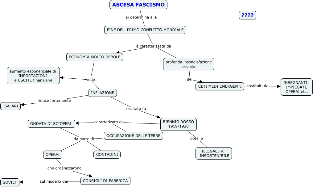 Questa Cmap, creata con IHMC CmapTools, contiene informazioni relative a: Il FASCISMO, FINE DEL PRIMO CONFLITTO MONDIALE è caratterizzata da ECONOMIA MOLTO DEBOLE, FINE DEL PRIMO CONFLITTO MONDIALE è caratterizzata da profonda insoddisfazione sociale, ONDATA DI SCIOPERI da parte di CONTADINI, OPERAI che organizzarono CONSIGLI DI FABBRICA, ASCESA FASCISMO si determina alla FINE DEL PRIMO CONFLITTO MONDIALE, ECONOMIA MOLTO DEBOLE vede aumento esponenziale di IMPORTAZIONI e USCITE finanziarie, OCCUPAZIONE DELLE TERRE da parte di CONTADINI, profonda insoddisfazione sociale dei CETI MEDI EMERGENTI, ONDATA DI SCIOPERI da parte di OPERAI, CETI MEDI EMERGENTI costituiti da INSEGNANTI, IMPIEGATI, OPERAI etc., OCCUPAZIONE DELLE TERRE da parte di OPERAI, ECONOMIA MOLTO DEBOLE vede INFLAZIONE, INFLAZIONE riduce fortemente SALARI, BIENNIO ROSSO 1919/1920 pota a ILLEGALITA' INSOSTENIBILE, INFLAZIONE il risultato fu BIENNIO ROSSO 1919/1920, CONSIGLI DI FABBRICA sul modello dei SOVIET, BIENNIO ROSSO 1919/1920 caratterizato da ONDATA DI SCIOPERI, BIENNIO ROSSO 1919/1920 caratterizato da OCCUPAZIONE DELLE TERRE