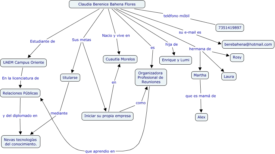 Este mapa conceptual tiene información relacionada a: bere-nice-quién soy-, Martha que es mamá de Alex, UAEM Campus Oriente En la licenciatura de Relaciones Públicas, Relaciones Públicas y del diplomado en Nevas tecnologías del conocimiento., Organizadora Profesional de Reuniones que aprendio en Relaciones Públicas, Claudia Berenice Bahena Flores es Organizadora Profesional de Reuniones, titularse mediante Nevas tecnologías del conocimiento., Claudia Berenice Bahena Flores Sus metas titularse, Claudia Berenice Bahena Flores hermana de Laura, Claudia Berenice Bahena Flores Estudiante de UAEM Campus Oriente, Claudia Berenice Bahena Flores hermana de Rosy