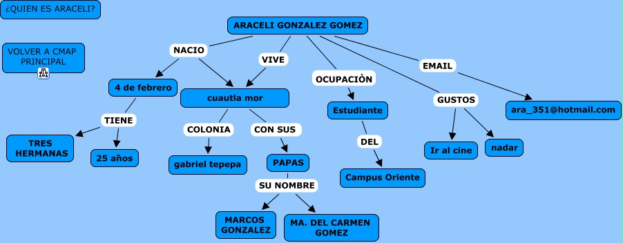 Este mapa conceptual tiene información relacionada a: presentacion de ara, ARACELI GONZALEZ GOMEZ NACIO cuautla mor, ARACELI GONZALEZ GOMEZ VIVE cuautla mor, ARACELI GONZALEZ GOMEZ NACIO 4 de febrero, 4 de febrero TIENE TRES HERMANAS, PAPAS SU NOMBRE MA. DEL CARMEN GOMEZ, PAPAS SU NOMBRE MARCOS GONZALEZ, ARACELI GONZALEZ GOMEZ GUSTOS Ir al cine, cuautla mor CON SUS PAPAS, cuautla mor COLONIA gabriel tepepa, Estudiante DEL Campus Oriente