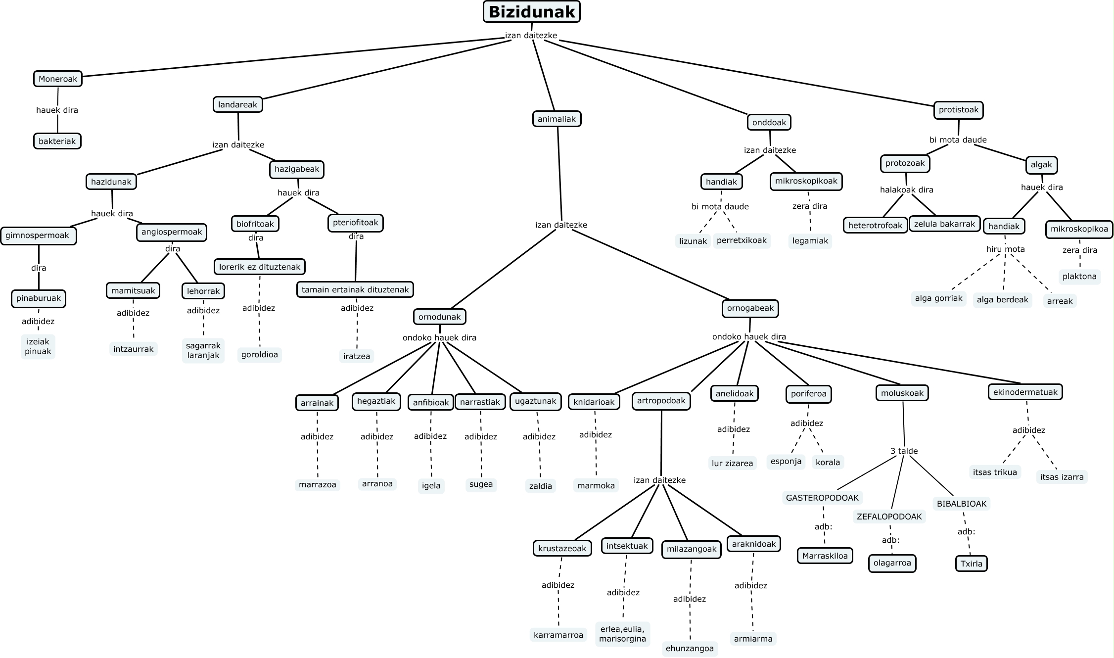Este mapa conceptual tiene información relacionada a: BIZIDUNAK, moluskoak 3 talde GASTEROPODOAK, handiak hiru mota alga berdeak, Bizidunak izan daitezke protistoak, narrastiak adibidez sugea, BIBALBIOAK adb: Txirla, onddoak izan daitezke handiak, moluskoak 3 talde BIBALBIOAK, hazidunak hauek dira gimnospermoak, protozoak halakoak dira zelula bakarrak, ornodunak ondoko hauek dira anfibioak