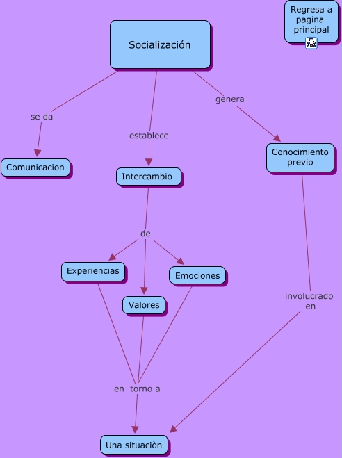 Este mapa conceptual tiene información relacionada a: socializacion, Intercambio de Valores, Socialización genera Conocimiento previo, Socialización se da Comunicacion, Experiencias en torno a Una situaciòn, Emociones en torno a Una situaciòn, Intercambio de Experiencias, Intercambio de Emociones, Socialización establece Intercambio, Valores en torno a Una situaciòn, Conocimiento previo involucrado en Una situaciòn