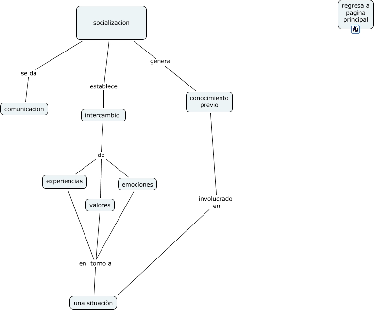 Este mapa conceptual tiene información relacionada a: socializacion 1, socializacion genera conocimiento previo, intercambio de valores, socializacion se da comunicacion, conocimiento previo involucrado en una situaciòn, experiencias en torno a una situaciòn, intercambio de emociones, intercambio de experiencias, emociones en torno a una situaciòn, valores en torno a una situaciòn, socializacion establece intercambio