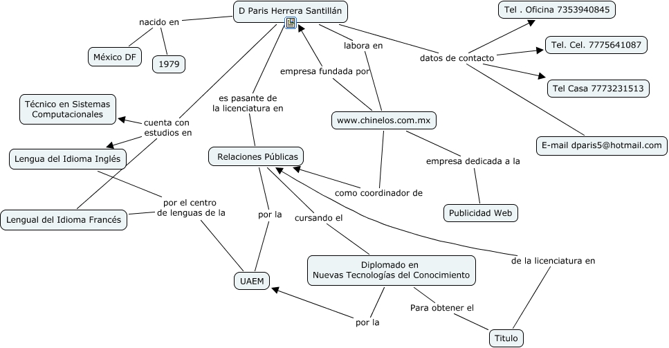 Este mapa conceptual tiene información relacionada a: D Paris Herrera Santillán, Diplomado en Nuevas Tecnologías del Conocimiento Para obtener el Titulo, Lengua del Idioma Inglés por el centro de lenguas de la UAEM, D Paris Herrera Santillán datos de contacto Tel. Cel. 7775641087, D Paris Herrera Santillán cuenta con estudios en Lengua del Idioma Inglés, D Paris Herrera Santillán datos de contacto Tel . Oficina 7353940845, D Paris Herrera Santillán es pasante de la licenciatura en Relaciones Públicas, D Paris Herrera Santillán nacido en México DF, D Paris Herrera Santillán datos de contacto Tel Casa 7773231513, D Paris Herrera Santillán labora en www.chinelos.com.mx, Relaciones Públicas por la UAEM