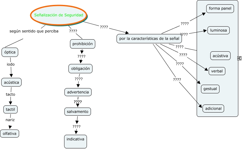 Este mapa conceptual tiene información relacionada a: Señalización_de_seguridad, salvamento ???? indicativa, acústica tacto tactil, por la características de la señal ???? adicional, prohibición ???? obligación, por la características de la señal ???? luminosa, por la características de la señal ???? verbal, obligación ???? advertencia, Señalización de Seguridad ???? por la características de la señal, tactil nariz olfativa, Señalización de Seguridad ???? prohibición, por la características de la señal ???? ????, por la características de la señal ???? forma panel, advertencia ???? salvamento, óptica iodo acústica, advertencia ???? salvamento, por la características de la señal ???? gestual, Señalización de Seguridad según sentido que perciba óptica