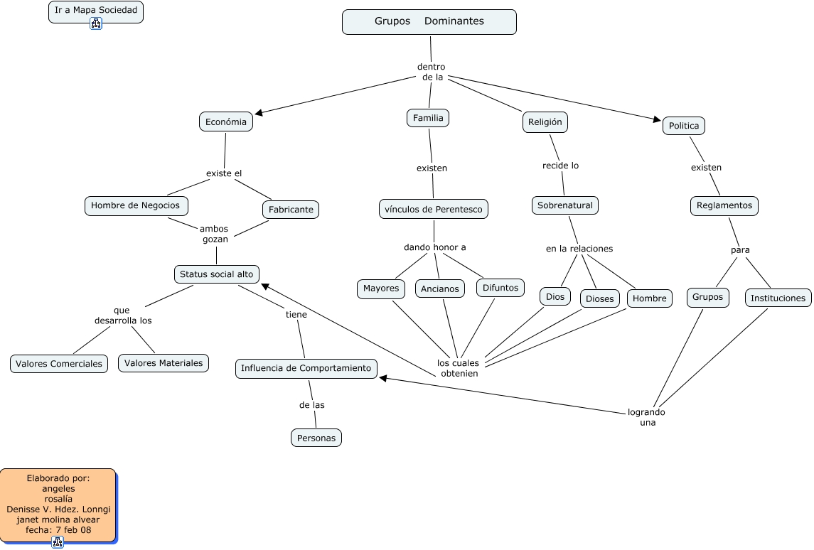 Este mapa conceptual tiene información relacionada a: Grupos Dominantes, Dioses los cuales obtenien Status social alto, Instituciones logrando una Influencia de Comportamiento, Grupos Dominantes dentro de la Religión, Reglamentos para Instituciones, Religión recide lo Sobrenatural, Politica existen Reglamentos, Económia existe el Hombre de Negocios, vínculos de Perentesco dando honor a Ancianos, Status social alto que desarrolla los Valores Materiales, Status social alto que desarrolla los Valores Comerciales