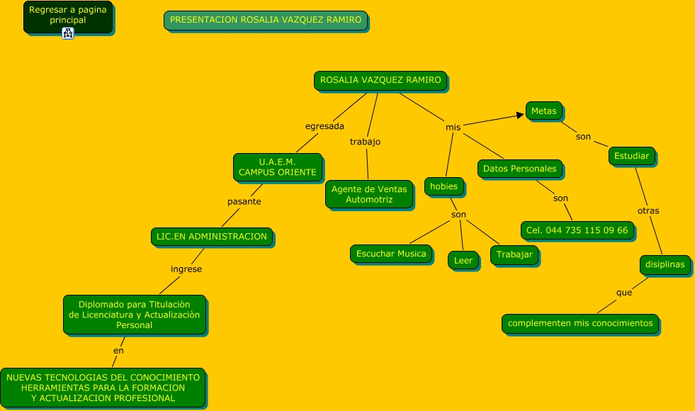 Este mapa conceptual tiene información relacionada a: Presentacion Rosalia Vazquez 2, ROSALIA VAZQUEZ RAMIRO mis Metas, ROSALIA VAZQUEZ RAMIRO mis hobies, Datos Personales son Cel. 044 735 115 09 66, ROSALIA VAZQUEZ RAMIRO mis Datos Personales, U.A.E.M. CAMPUS ORIENTE pasante LIC.EN ADMINISTRACION, ROSALIA VAZQUEZ RAMIRO trabajo Agente de Ventas Automotriz, ROSALIA VAZQUEZ RAMIRO egresada U.A.E.M. CAMPUS ORIENTE, LIC.EN ADMINISTRACION ingrese Diplomado para Titulaciòn de Licenciatura y Actualizaciòn Personal, Estudiar otras disiplinas, Diplomado para Titulaciòn de Licenciatura y Actualizaciòn Personal en NUEVAS TECNOLOGIAS DEL CONOCIMIENTO HERRAMIENTAS PARA LA FORMACION Y ACTUALIZACION PROFESIONAL