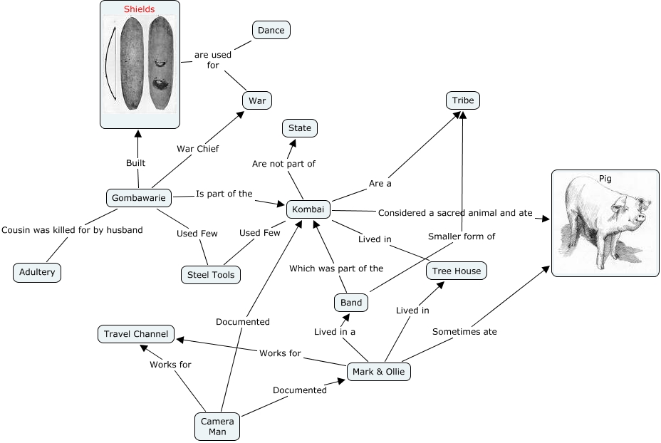 This Concept Map, created with IHMC CmapTools, has information related to: 16A_GGS14_D'Arcy, Shields are used for War, Gombawarie Is part of the Kombai, Mark & Ollie Lived in a Band, Band Which was part of the Kombai, Kombai Lived in Tree House, Camera Man Documented Mark & Ollie, Gombawarie Used Few Steel Tools, Kombai Used Few Steel Tools, Kombai Are a Tribe, Mark & Ollie Lived in Tree House, Kombai Considered a sacred animal and ate Pig, Gombawarie War Chief War, Mark & Ollie Works for Travel Channel, Kombai Are not part of State, Camera Man Works for Travel Channel, Gombawarie Cousin was killed for by husband Adultery, Gombawarie Built Shields, Camera Man Documented Kombai, Dance are used for War, Band Smaller form of Tribe