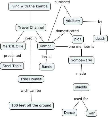 This Concept Map, created with IHMC CmapTools, has information related to: 16_A_GGS14_weinstein, Kombai one member is Gombawarie, Mark & Ollie lived in Tree Houses, Kombai lived in Tree Houses, living with the kombai ???? Travel Channel, Travel Channel ???? Mark & Ollie, Kombai punished Adultery, Kombai domesticated pigs, Gombawarie made shields, Adultery by death, Travel Channel ???? Kombai, shields used for Dance, Tree Houses wich can be 100 feet off the ground, shields used for war, Mark & Ollie presented Steel Tools, Kombai live in Bands