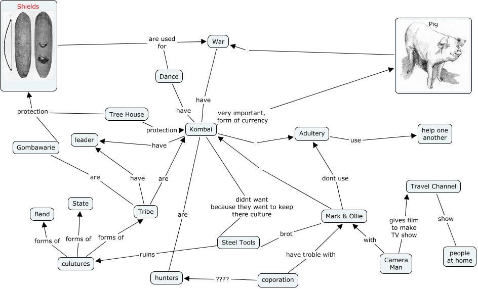 This Concept Map, created with IHMC CmapTools, has information related to: 16_A_GGS14_Stringer, Mark & Ollie brot Steel Tools, Gombawarie are Tribe, Tribe have leader, Camera Man with Mark & Ollie, Camera Man gives film to make TV show Travel Channel, Mark & Ollie dont use Adultery, culutures forms of Tribe, Tree House protection Kombai, Kombai have leader, Tree House protection Gombawarie, Kombai didnt want because they want to keep there culture Steel Tools, coporation ???? hunters, culutures forms of Band, Tribe are Kombai, War have Kombai, Steel Tools ruins culutures, Kombai are hunters, Dance have Kombai, Adultery use help one another, culutures forms of State