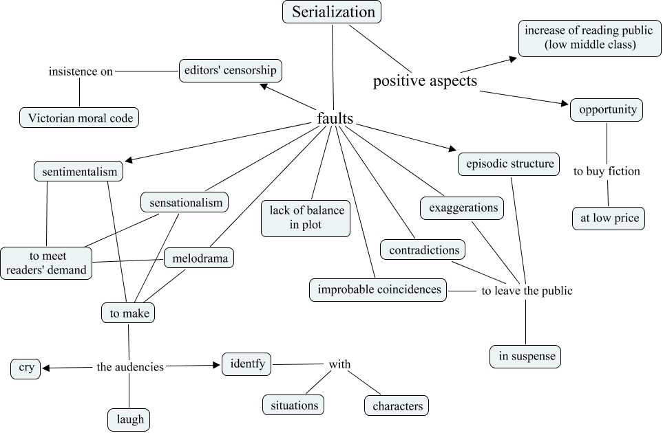 Questa Mappa Concettuale ha informazioni correlate a: C. Dickens - Serialization, Serialization faults improbable coincidences, Serialization faults exaggerations, sensationalism ???? to make, improbable coincidences to leave the public in suspense, Serialization positive aspects opportunity, to make the audencies cry, Serialization faults lack of balance in plot, Serialization faults sentimentalism, editors' censorship insistence on Victorian moral code, melodrama ???? to meet readers' demand