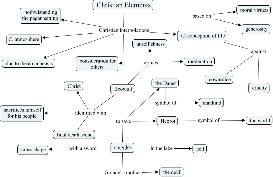 Questa Mappa Concettuale ha informazioni correlate a: The Epic Poem - Christian Elements, Beowulf virtues consideration for others, Beowulf to save stuggles, C. conception of life against cowardice, Christian Elements Christian interpolations due to the amanuensis, stuggles in the lake hell, Christian Elements Christian interpolations C. atmosphere, Beowulf identified with sacrifices himself for his people, Heorot symbol of the world, Beowulf virtues moderation, Christian Elements Christian interpolations Beowulf