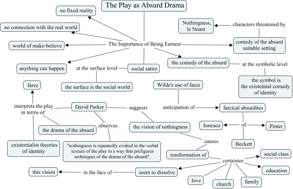 Questa Mappa Concettuale ha informazioni correlate a: The Play as Absurd drama, tranformation of certaintes love, tranformation of certaintes church, The Play as Absurd Drama The Importance of Being Earnest social satire, The Play as Absurd Drama The Importance of Being Earnest world of make-believe, The Play as Absurd Drama The Importance of Being Earnest anything can happen, the vision of nothingness causes tranformation of, seem to dissolve in the face of this vision, The Play as Absurd Drama The Importance of Being Earnest the comedy of the absurd, farcical absurdites of Pinter, social satire at the surface level the surface is the social world