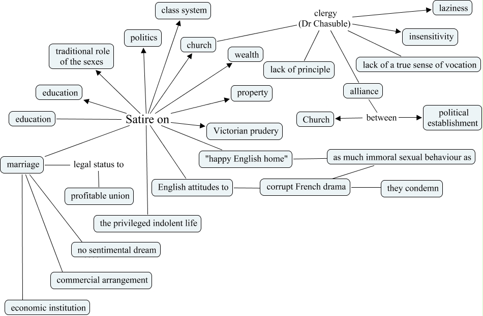 Questa Mappa Concettuale ha informazioni correlate a: The Importance of Being Earnest - satire, education Satire on marriage, church clergy (Dr Chasuble) lack of principle, church clergy (Dr Chasuble) lack of a true sense of vocation, as much immoral sexual behaviour as ???? corrupt French drama, education Satire on politics, church clergy (Dr Chasuble) laziness, marriage ???? economic institution, education Satire on property, education Satire on wealth, marriage ???? no sentimental dream