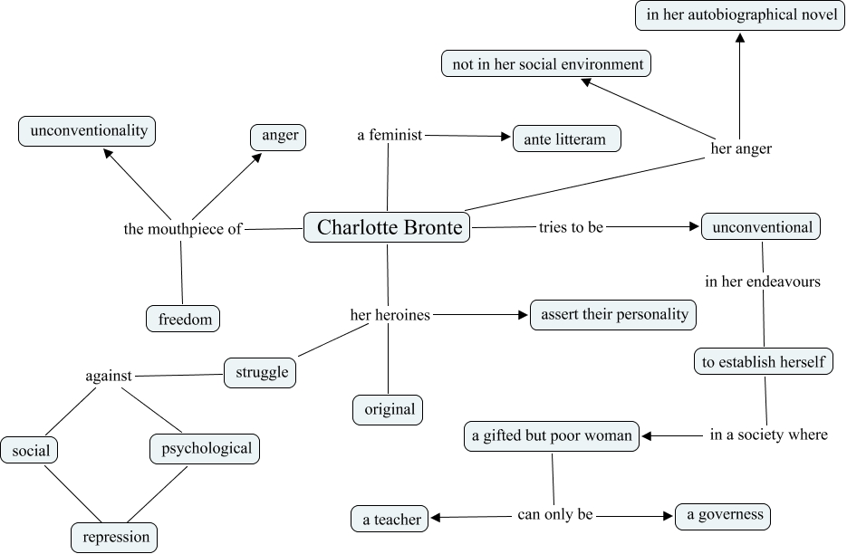 Questa Mappa Concettuale ha informazioni correlate a: Charlotte Bronte, Charlotte Bronte tries to be unconventional, Charlotte Bronte her anger not in her social environment, Charlotte Bronte her heroines struggle, Charlotte Bronte the mouthpiece of unconventionality, struggle against psychological, unconventional in her endeavours to establish herself, Charlotte Bronte the mouthpiece of freedom, struggle against social, Charlotte Bronte the mouthpiece of anger, to establish herself in a society where a gifted but poor woman