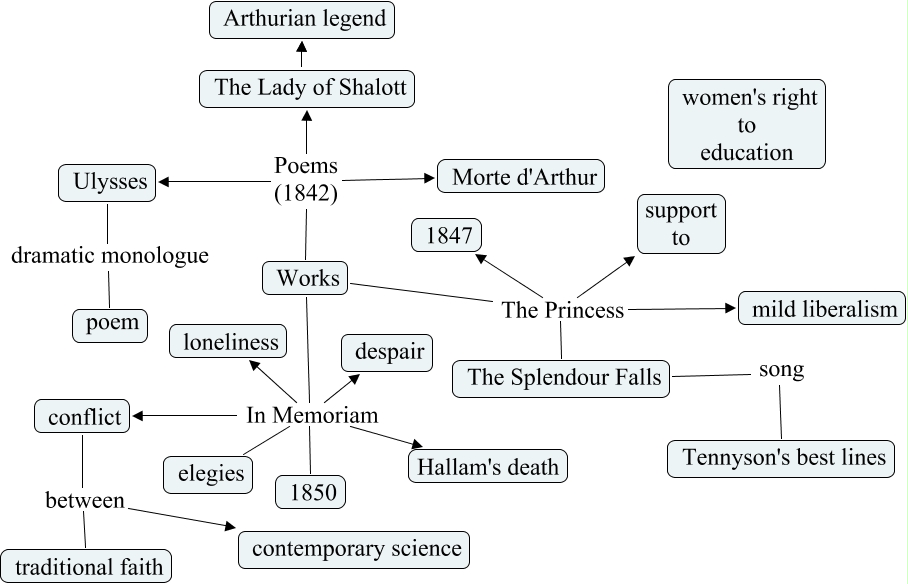 Questa Mappa Concettuale ha informazioni correlate a: Tennyson's works, Works In Memoriam loneliness, Works The Princess mild liberalism, Works Poems (1842) The Lady of Shalott, Works Poems (1842) Ulysses, The Lady of Shalott ???? Arthurian legend, The Lady of Shalott ???? Arthurian legend, Works In Memoriam 1850, Ulysses dramatic monologue poem, Works In Memoriam despair, Works In Memoriam Hallam's death