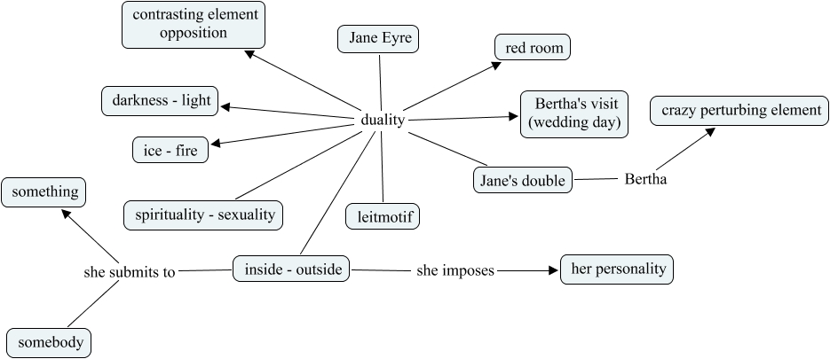 Questa Mappa Concettuale ha informazioni correlate a: Jane Eyre's duality, Jane Eyre duality darkness - light, Jane Eyre duality spirituality - sexuality, Jane Eyre duality ice - fire, Jane Eyre duality Jane's double, inside - outside she submits to somebody, Jane's double Bertha crazy perturbing element, Jane Eyre duality red room, Jane Eyre duality Bertha's visit (wedding day), inside - outside she imposes her personality, inside - outside she submits to something