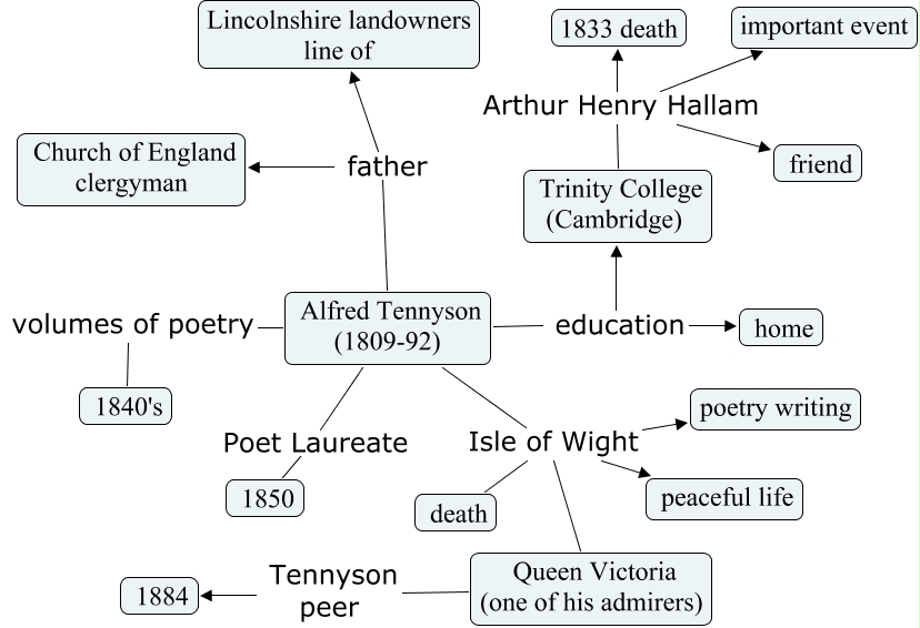 Questa Mappa Concettuale ha informazioni correlate a: Alfred Tennyson, Trinity College (Cambridge) Arthur Henry Hallam 1833 death, Alfred Tennyson (1809-92) Poet Laureate 1850, Alfred Tennyson (1809-92) Isle of Wight peaceful life, Alfred Tennyson (1809-92) Isle of Wight poetry writing, Alfred Tennyson (1809-92) volumes of poetry 1840's, Alfred Tennyson (1809-92) education Trinity College (Cambridge), Trinity College (Cambridge) Arthur Henry Hallam friend, Queen Victoria (one of his admirers) Tennyson peer 1884, Alfred Tennyson (1809-92) education home, Trinity College (Cambridge) Arthur Henry Hallam important event