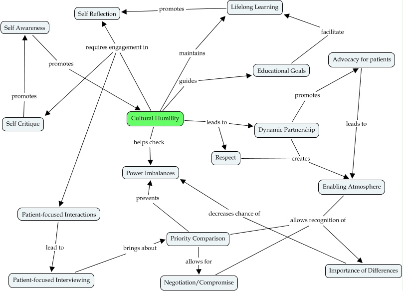 This Concept Map, created with IHMC CmapTools, has information related to: Cultural Humility, Advocacy for patients leads to Enabling Atmosphere, Cultural Humility requires engagement in Patient-focused Interactions, Priority Comparison allows recognition of Importance of Differences, Self Critique promotes Self Awareness, Enabling Atmosphere allows recognition of Importance of Differences, Respect creates Enabling Atmosphere, Patient-focused Interviewing brings about Priority Comparison, Cultural Humility requires engagement in Self Critique, Negotiation/Compromise allows recognition of Importance of Differences, Priority Comparison prevents Power Imbalances, Cultural Humility guides Educational Goals, Cultural Humility leads to Dynamic Partnership, Importance of Differences decreases chance of Power Imbalances, Priority Comparison allows for Negotiation/Compromise, Cultural Humility requires engagement in Self Reflection, Cultural Humility leads to Respect, Patient-focused Interactions lead to Patient-focused Interviewing, Cultural Humility maintains Lifelong Learning, Cultural Humility helps check Power Imbalances, Self Awareness promotes Cultural Humility
