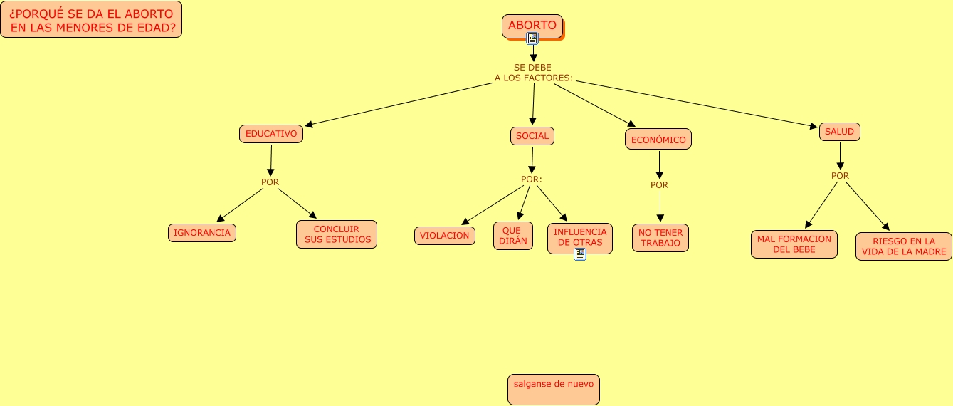 Este mapa conceptual tiene información relacionada a: ABORTO, SOCIAL POR: QUE DIRÁN, ABORTO SE DEBE A LOS FACTORES: SOCIAL, ECONÓMICO POR NO TENER TRABAJO, ABORTO SE DEBE A LOS FACTORES: SALUD, SOCIAL POR: INFLUENCIA DE OTRAS, ABORTO SE DEBE A LOS FACTORES: ECONÓMICO, SALUD POR RIESGO EN LA VIDA DE LA MADRE, SALUD POR MAL FORMACION DEL BEBE, EDUCATIVO POR IGNORANCIA, EDUCATIVO POR CONCLUIR SUS ESTUDIOS