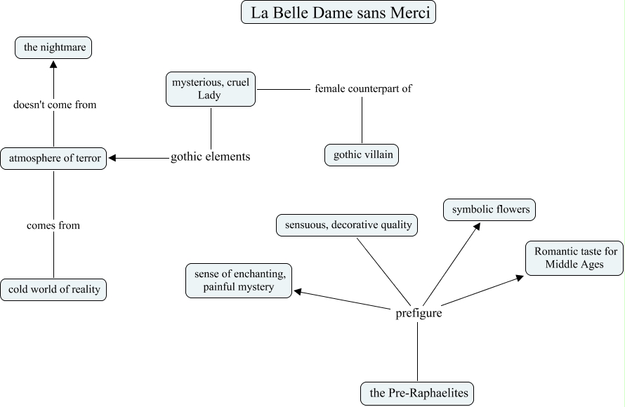 Questa Mappa Concettuale ha informazioni correlate a: La Belle Dame sans Merci - Gothic elements. The Pre- Raphaelites' predilection for the poem, sensuous, decorative quality prefigure sense of enchanting, painful mystery, mysterious, cruel Lady female counterpart of gothic villain, atmosphere of terror comes from cold world of reality, mysterious, cruel Lady gothic elements atmosphere of terror, atmosphere of terror doesn't come from the nightmare, sensuous, decorative quality prefigure symbolic flowers, sensuous, decorative quality prefigure the Pre-Raphaelites, sensuous, decorative quality prefigure Romantic taste for Middle Ages