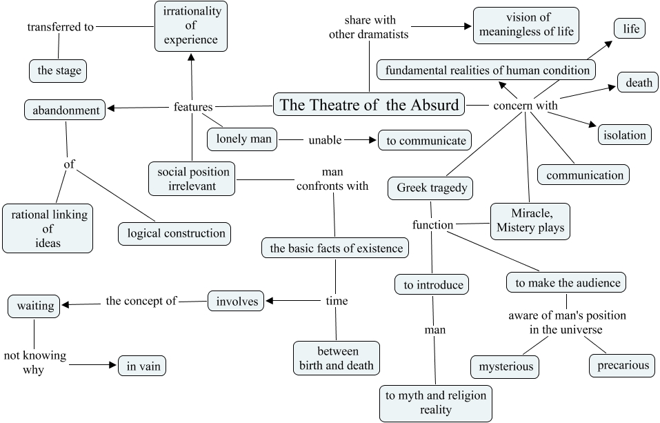 Questa Mappa Concettuale ha informazioni correlate a: The Theatre of the Absurd - The Greek tragedy - The Mistery plays, The Theatre of the Absurd share with other dramatists vision of meaningless of life, Greek tragedy concern with death, Miracle, Mistery plays function to introduce, Miracle, Mistery plays function to make the audience, social position irrelevant man confronts with the basic facts of existence, to introduce man to myth and religion reality, Greek tragedy concern with communication, The Theatre of the Absurd features social position irrelevant, The Theatre of the Absurd concern with fundamental realities of human condition, Greek tragedy concern with life