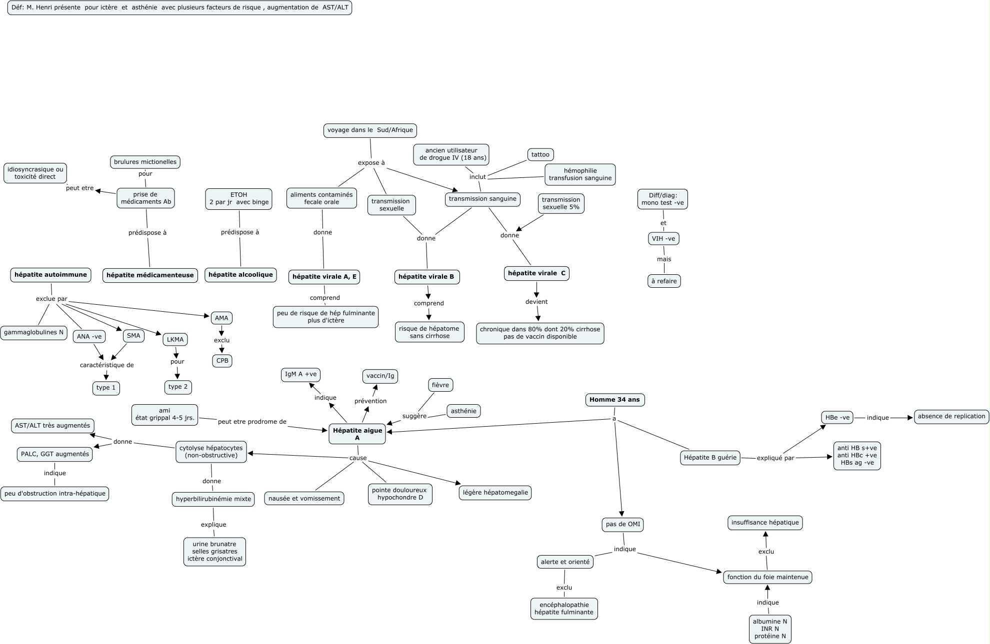 This Concept Map, created with IHMC CmapTools, has information related to: APP7retour, Hépatite aigue A cause nausée et vomissement, transmission sanguine donne hépatite virale B, Hépatite B guérie expliqué par HBe -ve, aliments contaminés fecale orale donne hépatite virale A, E, SMA caractéristique de type 1, Hépatite aigue A indique IgM A +ve, Homme 34 ans a Hépatite B guérie, hyperbilirubinémie mixte explique urine brunatre selles grisatres ictère conjonctival, brulures mictionelles pour prise de médicaments Ab, transmission sexuelle donne hépatite virale B, transmission sexuelle 5% donne hépatite virale C, Diff/diag: mono test -ve et VIH -ve, AMA exclu CPB, hépatite virale C devient chronique dans 80% dont 20% cirrhose pas de vaccin disponible, Hépatite aigue A cause pointe douloureux hypochondre D, fonction du foie maintenue exclu insuffisance hépatique, hépatite autoimmune exclue par ANA -ve, Hépatite aigue A prévention vaccin/Ig, Hépatite aigue A cause cytolyse hépatocytes (non-obstructive), tattoo inclut transmission sanguine