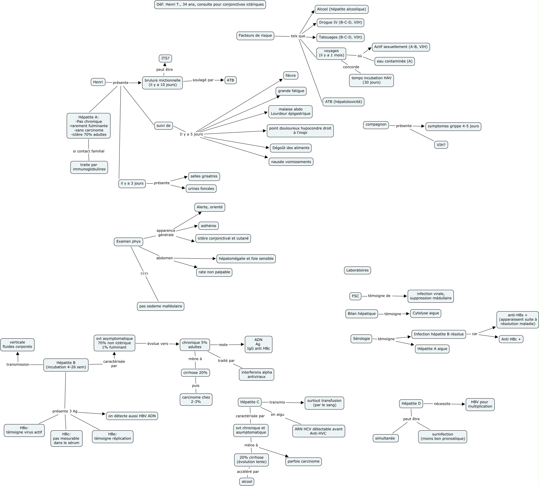 This Concept Map, created with IHMC CmapTools, has information related to: app7 retour, Hépatite B (incubation 4-26 sem) caractérisée par svt asymptomatique 70% non ictérique 1% fulminant, suivi de Il y a 5 jours point douloureux hypocondre droit à l'inspi, Bilan hépatique témoigne Cytolyse aigue, suivi de Il y a 5 jours nausée vomissements, suivi de Il y a 5 jours fièvre, svt chronique et asymptomatique mène à parfois carcinome, chronique 5% adultes traité par interferons alpha antiviraux, Infection hépatite B résolue car anti-HBs + (apparaissent suite à résolution maladie), Henri présente brulure mictionnelle (il y a 10 jours), Hépatite A: -Pas chronique -rarement fulminante -sans carcinome -ictère 70% adultes si contact familial traite par immunoglobulines, Henri présente il y a 3 jours, Examen phys ???? pas oedeme malléolaire, suivi de Il y a 5 jours malaise abdo Lourdeur épigastrique, svt asymptomatique 70% non ictérique 1% fulminant évolue vers chronique 5% adultes, Henri présente Hépatite A: -Pas chronique -rarement fulminante -sans carcinome -ictère 70% adultes, Examen phys apparence générale ictère conjonctival et cutané, Facteurs de risque tels que Tatouages (B-C-D, VIH), 20% cirrhose (évolution lente) accéléré par alcool, Hépatite B (incubation 4-26 sem) présente 3 Ag HBs: témoigne virus actif, Facteurs de risque tels que voyages (il y a 1 mois)