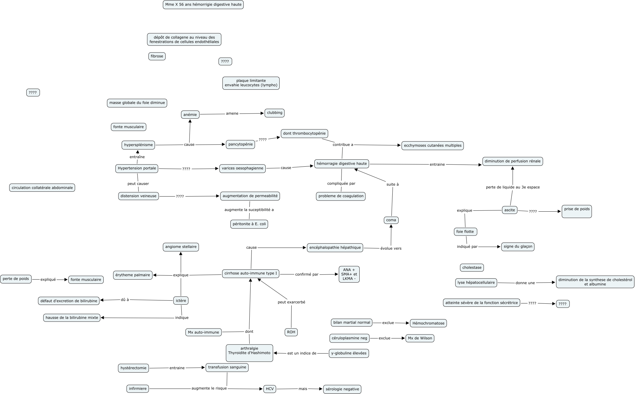 This Concept Map, created with IHMC CmapTools, has information related to: APP8 aller, anémie amene clubbing, ictère dû à défaut d'excretion de bilirubine, dont thrombocytopénie contribue a hémorragie digestive haute, Hypertension portale ???? varices oesophagienne, cirrhose auto-immune type I explique érytheme palmaire, distension veineuse ???? augmentation de permeabilité, y-globuline élevées est un indice de arthralgie Thyroidite d'Hashimoto, dont thrombocytopénie contribue a ecchymoses cutanées multiples, HCV mais sérologie negative, pancytopénie ???? dont thrombocytopénie, ascite ???? prise de poids, foie flotte indiqué par signe du glaçon, coma suite à hémorragie digestive haute, encéphalopathie hépathique évolue vers coma, transfusion sanguine augmente le risque HCV, Mx auto-immune dont cirrhose auto-immune type I, ascite explique foie flotte, ictère indique hausse de la bilirubine mixte, cirrhose auto-immune type I explique ictère, hémorragie digestive haute compliquée par probleme de coagulation