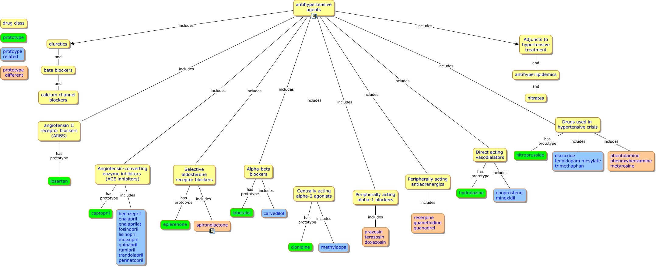 This Concept Map, created with IHMC CmapTools, has information related to: antihypertensives, Alpha-beta blockers has prototype labetalol, Angiotensin-converting enzyme inhibitors (ACE inhibitors) has prototype captopril, Drugs used in hypertensive crisis includes diazoxide fenoldopam mesylate trimethaphan, Drugs used in hypertensive crisis has prototype nitroprusside, Selective aldosterone receptor blockers has prototype eplerenone, Centrally acting alpha-2 agonists has prototype clonidine, antihypertensive agents includes Peripherally acting antiadrenergics, antihypertensive agents includes Direct acting vasodialators, antihypertensive agents includes Selective aldosterone receptor blockers, Peripherally acting alpha-1 blockers includes prazosin terazosin doxazosin, antihypertensive agents includes Adjuncts to hypertensive treatment, Alpha-beta blockers includes carvedilol, Drugs used in hypertensive crisis includes phentolamine phenoxybenzamine metyrosine, Direct acting vasodialators includes epoprostenol minoxidil, antihyperlipidemics and nitrates, antihypertensive agents includes Centrally acting alpha-2 agonists, Centrally acting alpha-2 agonists includes methyldopa, antihypertensive agents includes Alpha-beta blockers, Adjuncts to hypertensive treatment and antihyperlipidemics, angiotensin II receptor blockers (ARBS) has prototype losartan