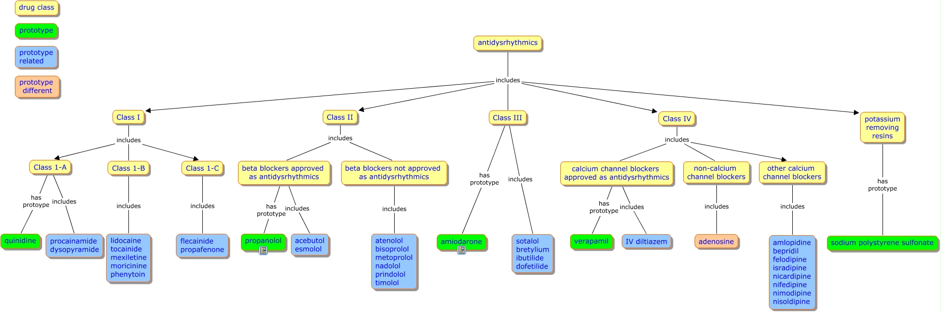 This Concept Map, created with IHMC CmapTools, has information related to: antidysrhythmics, antidysrhythmics includes Class IV, Class 1-C includes flecainide propafenone, calcium channel blockers approved as antidysrhythmics has prototype verapamil, antidysrhythmics includes Class II, beta blockers approved as antidysrhythmics includes acebutol esmolol, non-calcium channel blockers includes adenosine, antidysrhythmics includes Class III, Class I includes Class 1-A, Class IV includes calcium channel blockers approved as antidysrhythmics, potassium removing resins has prototype sodium polystyrene sulfonate, antidysrhythmics includes Class I, calcium channel blockers approved as antidysrhythmics includes IV diltiazem, Class III has prototype amiodarone, other calcium channel blockers includes amlopidine bepridil felodipine isradipine nicardipine nifedipine nimodipine nisoldipine, Class 1-B includes lidocaine tocainide mexiletine moricinine phenytoin, Class IV includes other calcium channel blockers, beta blockers not approved as antidysrhythmics includes atenolol bisoprolol metoprolol nadolol prindolol timolol, Class III includes sotalol bretylium ibutilide dofetilide, beta blockers approved as antidysrhythmics has prototype propanolol, Class 1-A includes procainamide dysopyramide