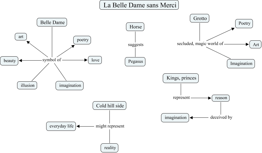Questa Mappa Concettuale ha informazioni correlate a: La Belle Dame sans Merci - Symbols, Horse suggests Pegasus, Grotto secluded, magic world of Art, Cold hill side might represent reality, Cold hill side might represent everyday life, Belle Dame symbol of art, Grotto secluded, magic world of Poetry, Kings, princes represent reason, Belle Dame symbol of love, Belle Dame symbol of illusion, Belle Dame symbol of beauty