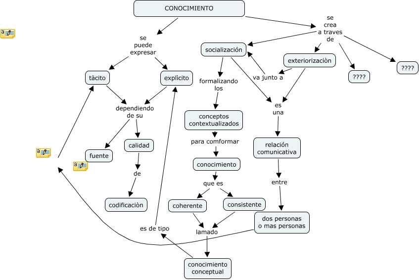 Este mapa conceptual tiene información relacionada a: CONOCIMIENTO, exteriorizaciòn va junto a socialización, tàcito dependiendo de su fuente, CONOCIMIENTO se crea a traves de exteriorizaciòn, consistente lamado conocimiento conceptual, coherente lamado conocimiento conceptual, CONOCIMIENTO se crea a traves de ????, exteriorizaciòn es una relación comunicativa, conocimiento que es coherente, explìcito dependiendo de su fuente, socialización es una relación comunicativa, conocimiento conceptual es de tipo explìcito, socialización formalizando los conceptos contextualizados, CONOCIMIENTO se crea a traves de socialización, conceptos contextualizados para comformar conocimiento, CONOCIMIENTO se puede expresar explìcito, relación comunicativa entre dos personas o mas personas, calidad de codificaciòn, CONOCIMIENTO se crea a traves de ????, tàcito dependiendo de su calidad, dos personas o mas personas tàcito
