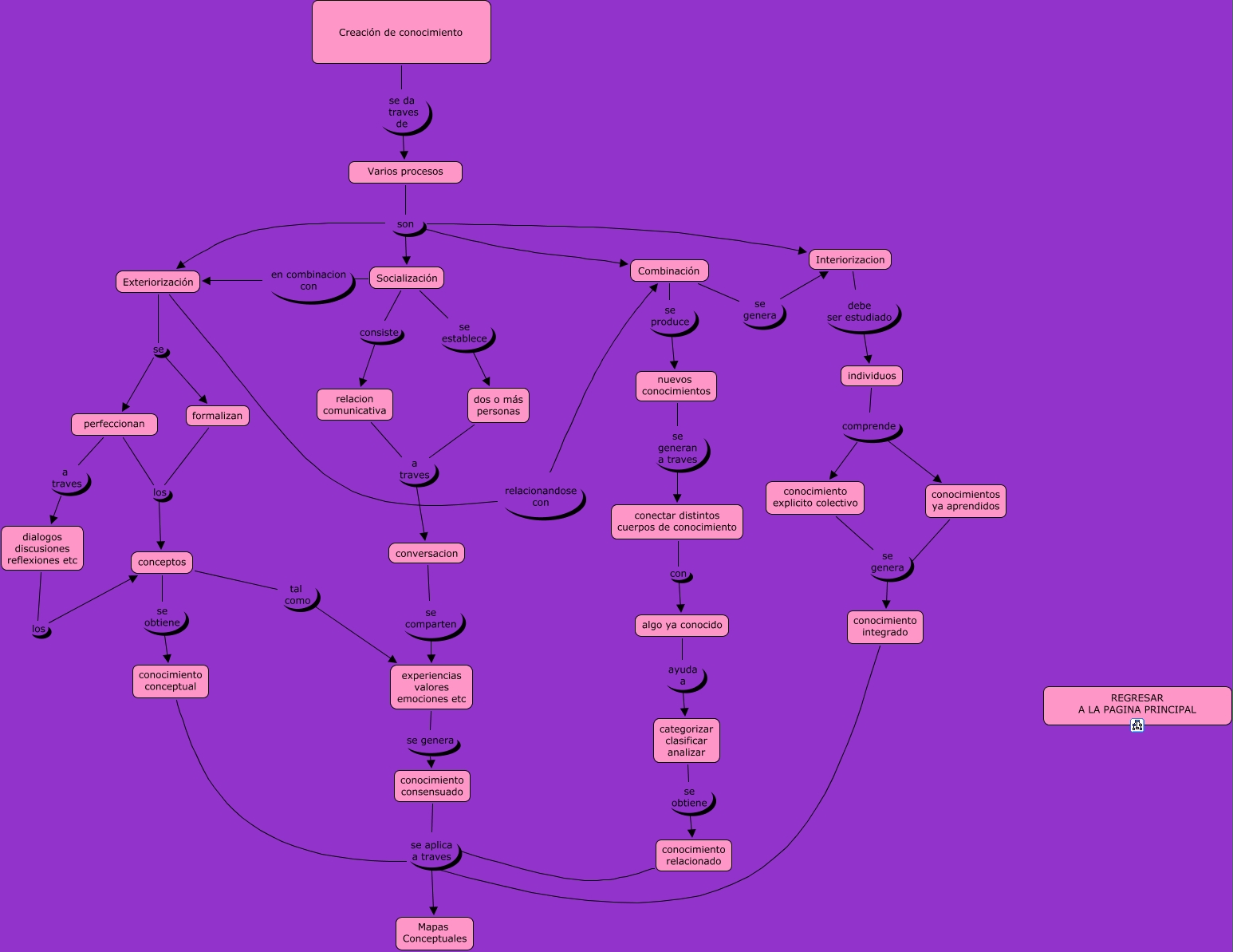 Este mapa conceptual tiene información relacionada a: OPERACIONES DE CREACION DE CONOCIMIENTO, relacion comunicativa a traves conversacion, Socialización se establece dos o más personas, conversacion se comparten experiencias valores emociones etc, individuos comprende conocimientos ya aprendidos, Exteriorización relacionandose con Combinación, Varios procesos son Interiorizacion, perfeccionan a traves dialogos discusiones reflexiones etc, categorizar clasificar analizar se obtiene conocimiento relacionado, Exteriorización se perfeccionan, Socialización consiste relacion comunicativa