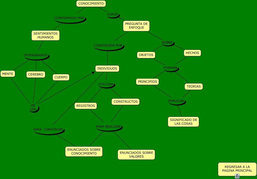 Este mapa conceptual tiene información relacionada a: CONOCIMIENTO 1, TEORIAS EXPLICAN SIGNIFICADO DE LAS COSAS, INDIVIDUOS UTILIZAN CONSTRUCTOS, PREGUNTA DE ENFOQUE SOBRE OBJETOS, HECHOS FORMAN PRINCIPIOS, OBJETOS FORMAN TEORIAS, CONOCIMIENTO CONFORMADO POR SENTIMIENTOS HUMANOS, SENTIMIENTOS HUMANOS INTENGRANDO CEREBRO, SENTIMIENTOS HUMANOS INTENGRANDO CUERPO, INDIVIDUOS UTILIZAN REGISTROS, CONSTRUCTOS PARA REALIZAR ENUNCIADOS SOBRE VALORES