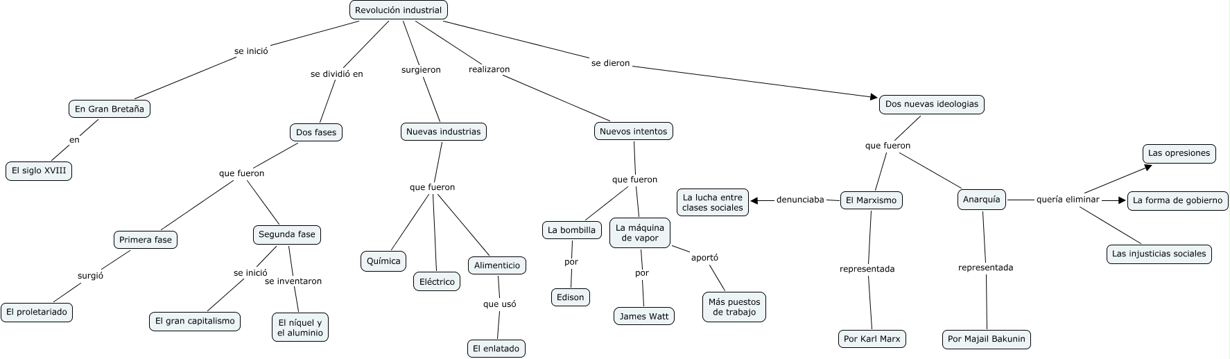 Este mapa conceptual tiene información relacionada a: 24.Miguel Romero Aragonés.Revolución Industrial, Dos nuevas ideologias que fueron El Marxismo, Revolución industrial realizaron Nuevos intentos, Nuevas industrias que fueron Alimenticio, Anarquía quería eliminar Las injusticias sociales, La bombilla por Edison, Anarquía quería eliminar Las opresiones, Segunda fase se inventaron El níquel y el aluminio, Anarquía quería eliminar La forma de gobierno, Anarquía representada Por Majail Bakunin, Nuevos intentos que fueron La máquina de vapor