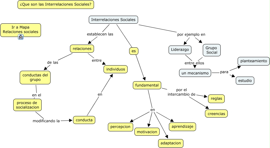 Este mapa conceptual tiene información relacionada a: interrelaciones, fundamental en motivacion, proceso de socializacion modificando la conducta, Liderazgo entre ellos un mecanismo, fundamental en adaptacion, Interrelaciones Sociales fundamental, fundamental en percepcion, fundamental en aprendizaje, Grupo Social entre ellos un mecanismo, fundamental por el intercambio de reglas, conducta en individuos