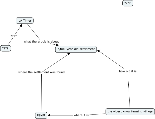 This Concept Map, created with IHMC CmapTools, has information related to: Brian, meggggggiiiieeeee. jared dani california, ???? ???? LA Times, Egypt where the settlement was found 7,000 year-old settlement, the oldest know farming village how old it is 7,000 year-old settlement, LA Times what the article is about 7,000 year-old settlement, the oldest know farming village where it is Egypt