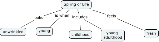 This Concept Map, created with IHMC CmapTools, has information related to: springmap, Spring of Life is when young, Spring of Life feels fresh, Spring of Life includes young adulthood, Spring of Life includes childhood, Spring of Life looks unwrinkled