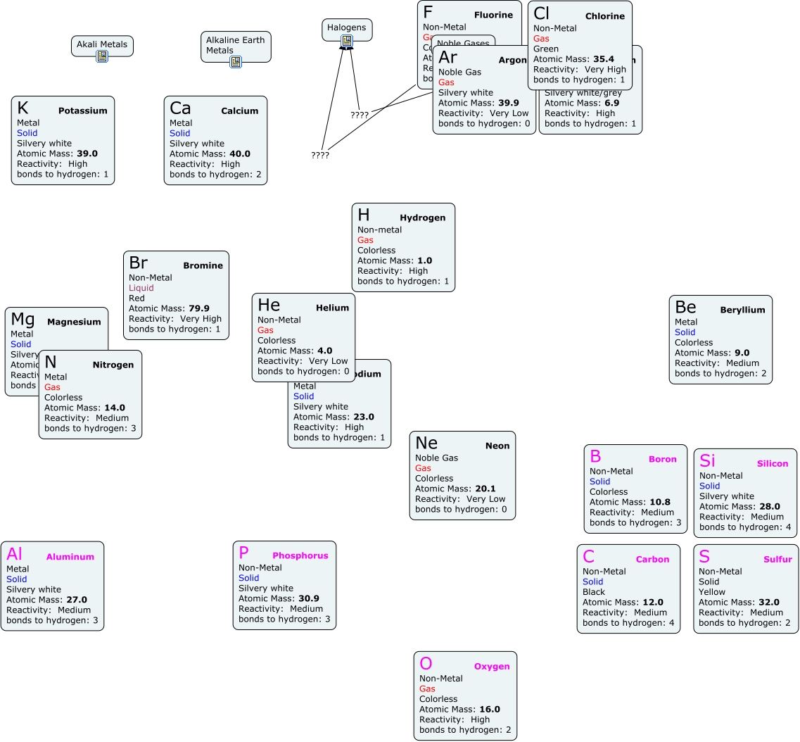 This Concept Map, created with IHMC CmapTools, has information related to: Lab 14 Jesse, F Fluorine Non-Metal Gas Colorless Atomic Mass: 19.0 Reactivity: Very High bonds to hydrogen: 1 ???? Halogens, Cl Chlorine Non-Metal Gas Green Atomic Mass: 35.4 Reactivity: Very High bonds to hydrogen: 1 ???? Halogens, Ar Argon Noble Gas Gas Silvery white Atomic Mass: 39.9 Reactivity: Very Low bonds to hydrogen: 0 ???? Noble Gases