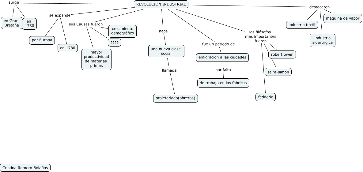 Este mapa conceptual tiene información relacionada a: 19.Cristina Romero Bolaños- REVOLUCION INDUSTRIAL, emigracion a las ciudades por falta de trabajo en las fábricas, REVOLUCION INDUSTRIAL los filósofos más importantes fueron fedderic, REVOLUCION INDUSTRIAL sus Causas fueron mayor productividad de materias primas, REVOLUCION INDUSTRIAL surge en Gran Bretaña, REVOLUCION INDUSTRIAL destacaron máquina de vapor, REVOLUCION INDUSTRIAL destacaron industria textil, REVOLUCION INDUSTRIAL surge en 1730, REVOLUCION INDUSTRIAL se expande en 1780, REVOLUCION INDUSTRIAL los filósofos más importantes fueron saint-simon, REVOLUCION INDUSTRIAL se expande por Europa