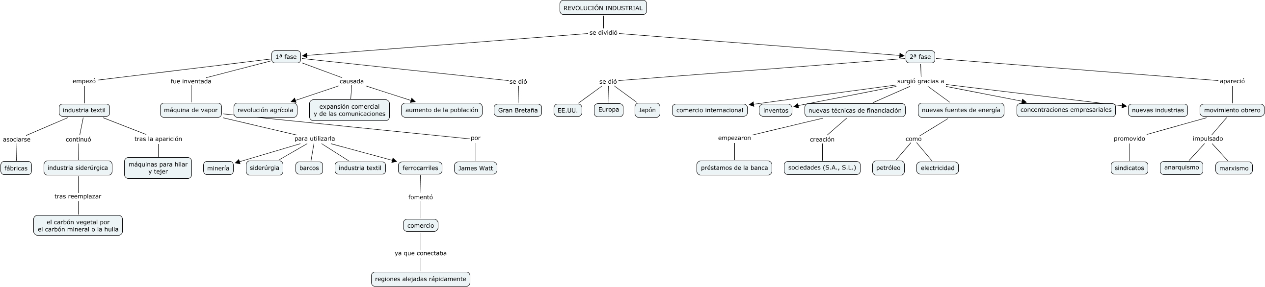 Este Cmap, tiene información relacionada con: 17.Carlos Rodríguez Daza revolucion industrial, 1ª fase causada aumento de la población, industria textil tras la aparición máquinas para hilar y tejer, 2ª fase surgió gracias a concentraciones empresariales, máquina de vapor por James Watt, comercio ya que conectaba regiones alejadas rápidamente, máquina de vapor para utilizarla ferrocarriles, nuevas fuentes de energía como petróleo, industria textil continuó industria siderúrgica, 2ª fase se dió Japón, 1ª fase causada expansión comercial y de las comunicaciones, movimiento obrero impulsado marxismo, 1ª fase se dió Gran Bretaña, REVOLUCIÓN INDUSTRIAL se dividió 2ª fase, nuevas fuentes de energía como electricidad, industria textil asociarse fábricas, 2ª fase surgió gracias a inventos, 2ª fase surgió gracias a nuevas técnicas de financiación, REVOLUCIÓN INDUSTRIAL se dividió 1ª fase, 1ª fase empezó industria textil, máquina de vapor para utilizarla siderúrgia