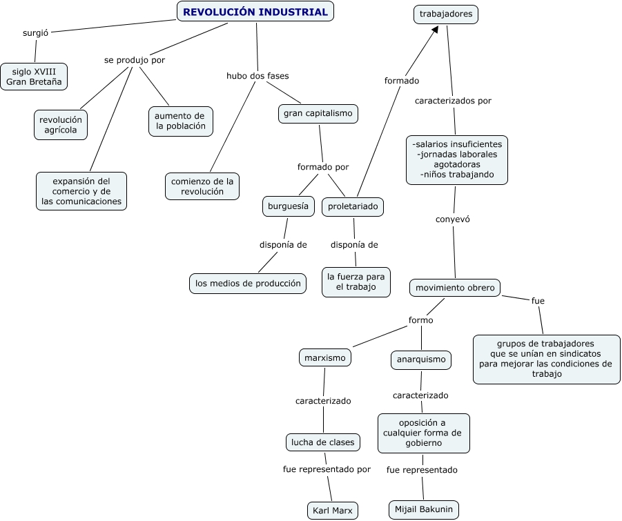 Este mapa conceptual tiene información relacionada a: 14.Marina Jiménez Pérez, proletariado formado trabajadores, anarquismo caracterizado oposición a cualquier forma de gobierno, movimiento obrero formo marxismo, trabajadores caracterizados por -salarios insuficientes -jornadas laborales agotadoras -niños trabajando, -salarios insuficientes -jornadas laborales agotadoras -niños trabajando conyevó movimiento obrero, burguesía disponía de los medios de producción, gran capitalismo formado por burguesía, REVOLUCIÓN INDUSTRIAL se produjo por revolución agrícola, REVOLUCIÓN INDUSTRIAL hubo dos fases gran capitalismo, movimiento obrero fue grupos de trabajadores que se unían en sindicatos para mejorar las condiciones de trabajo