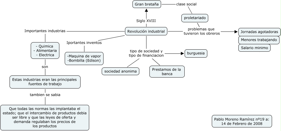 Este mapa conceptual tiene información relacionada a: Nº19-Pablo Moreno Ramírez-Revolución industrial, Jornadas agotadoras Menores trabajando, Revolución industrial tipo de sociedad y tipo de financiacion sociedad anonima, Revolución industrial tipo de sociedad y tipo de financiacion burguesia, Revolución industrial tipo de sociedad y tipo de financiacion Prestamos de la banca, Estas industrias eran las principales fuentes de trabajo tambien se sabia Que todas las normas las implantaba el estado; que el intercambio de productos debia ser libre y que las leyes de oferta y demanda regulaban los precios de los productos, Revolución industrial Importantes industrias - Quimica - Alimentaria - Electrica, Revolución industrial Siglo XVIII Gran bretaña, proletariado problemas que tuvieron los obreros Jornadas agotadoras, - Quimica - Alimentaria - Electrica son Estas industrias eran las principales fuentes de trabajo, Revolución industrial Iportantes inventos -Maquina de vapor -Bombilla (Edison)