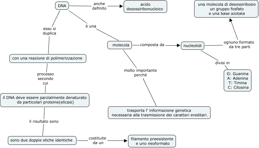 Questa Mappa Concettuale ha informazioni correlate a: dna, sono due doppie eliche identiche costituite da un filamento preesistente e uno neoformato, DNA è una molecola, molecola molto importante perchè trasporta l' informazione genetica necessaria alla trasmissione dei caratteri ereditari., DNA anche definito acido desossiribonucleico, nucleotidi divisi in G: Guanina A: Adenina T: Timina C: Citosina, molecola composta da nucleotidi, DNA esso si duplica con una reazione di polimerizzazione, il DNA deve essere parzialmente denaturato da particolari proteine(elicasi) il risultato sono sono due doppie eliche identiche, nucleotidi ognuno formato da tre parti una molecola di desossiribosio un gruppo fosfato e una base azotata, con una reazione di polimerizzazione processo secondo cui il DNA deve essere parzialmente denaturato da particolari proteine(elicasi)