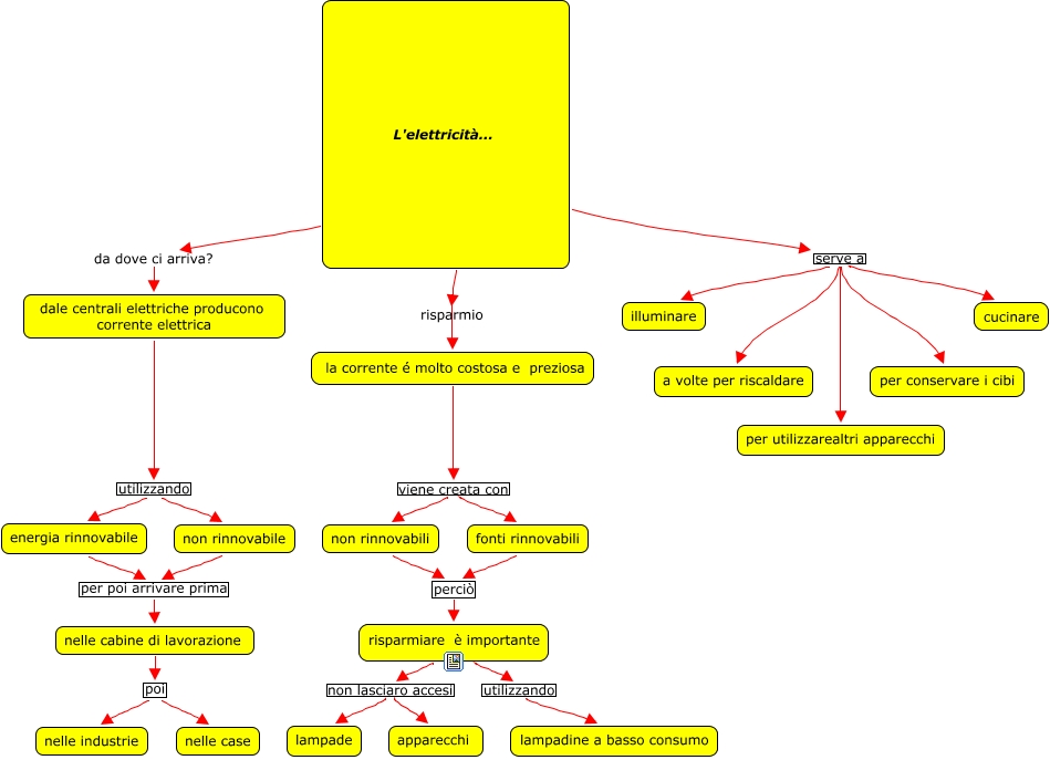 Questa Cmap, creata con IHMC CmapTools, contiene informazioni relative a: elettricità, nelle cabine di lavorazione poi nelle case, L'elettricità... serve a a volte per riscaldare, L'elettricità... serve a per utilizzarealtri apparecchi, dale centrali elettriche producono corrente elettrica utilizzando energia rinnovabile, L'elettricità... serve a illuminare, L'elettricità... da dove ci arriva? dale centrali elettriche producono corrente elettrica, fonti rinnovabili perciò risparmiare è importante, energia rinnovabile per poi arrivare prima nelle cabine di lavorazione, dale centrali elettriche producono corrente elettrica utilizzando non rinnovabile, risparmiare è importante non lasciaro accesi lampade, nelle cabine di lavorazione poi nelle industrie, non rinnovabili perciò risparmiare è importante, risparmiare è importante non lasciaro accesi apparecchi, L'elettricità... serve a cucinare, la corrente é molto costosa e preziosa viene creata con fonti rinnovabili, L'elettricità... risparmio la corrente é molto costosa e preziosa, risparmiare è importante utilizzando lampadine a basso consumo, L'elettricità... serve a per conservare i cibi, non rinnovabile per poi arrivare prima nelle cabine di lavorazione, la corrente é molto costosa e preziosa viene creata con non rinnovabili